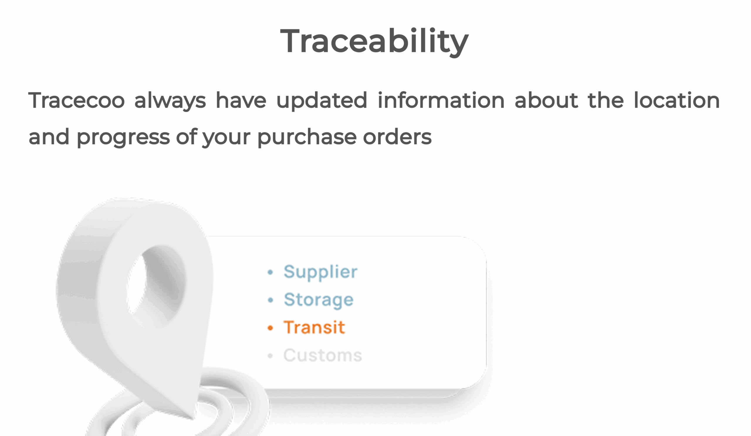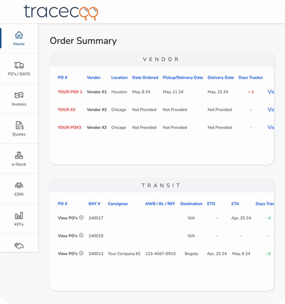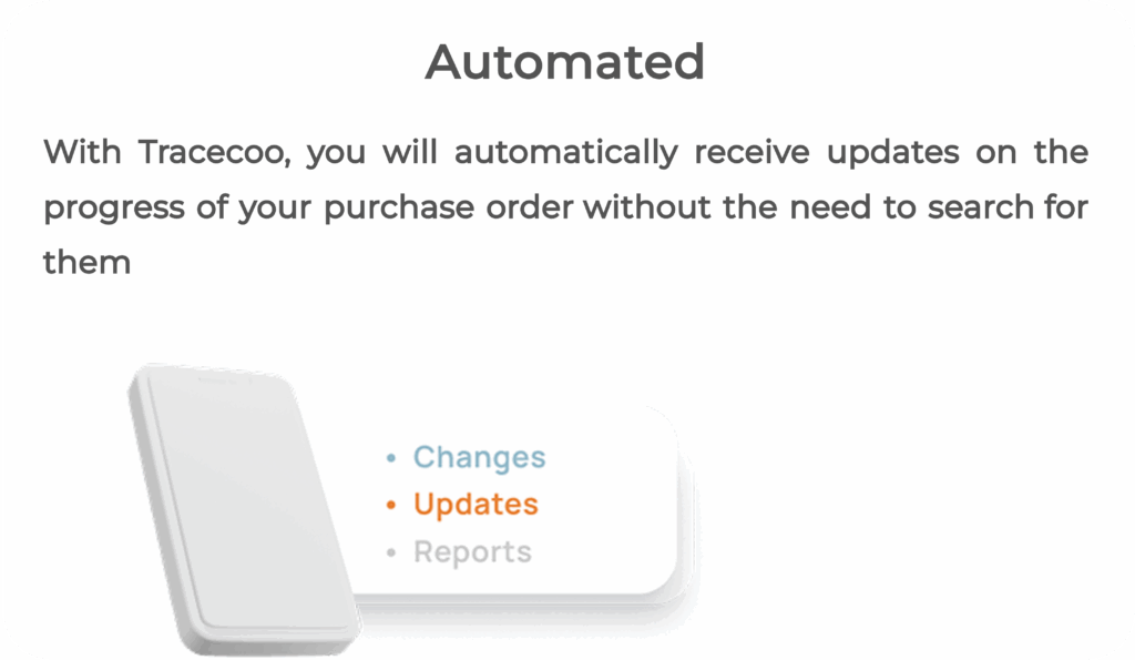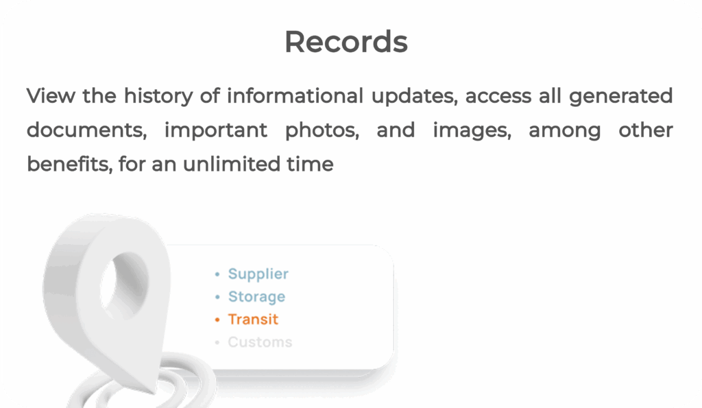 With Tracecoo, your information is continuously updated from the generation of the purchase order to its arrival at the final destination. Tracecoo utilizes an updated database with images and formats that detail the progress of your order throughout the logistics process.